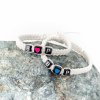 Náramek je vyroben prastarou technikou drhání – macramé. Tato technika pochází z arabských zemí a do Evropy se dostala asi ve 13. století. Náramek je vytvořen z bavlněné voskované příze a plastových kostiček černé barvy. Velikost kostiček – 6 mm. Použité materiály jsou skvělou alternativou, pokud máte alergii na bižuterní kov.