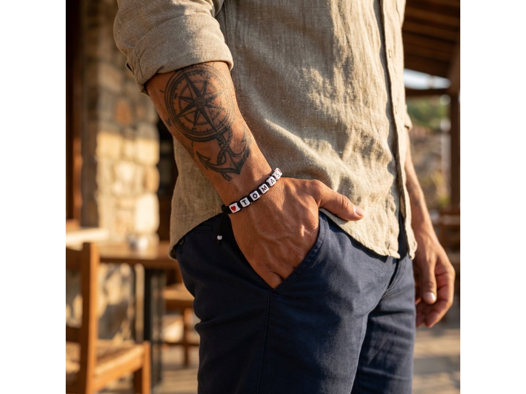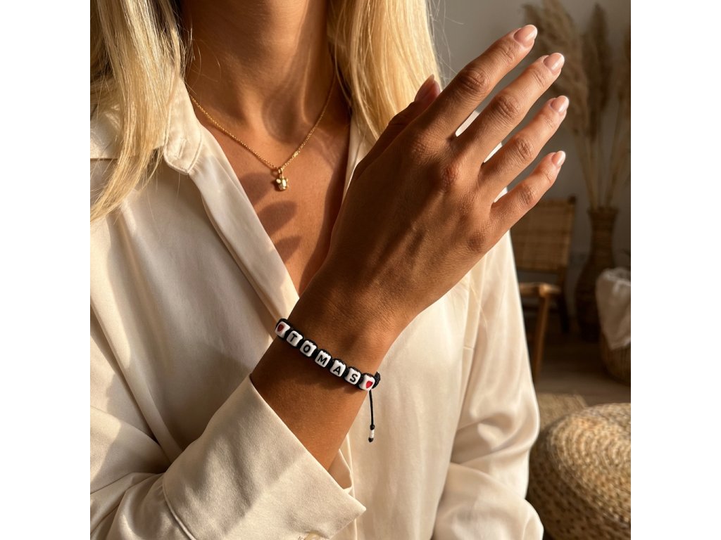 Náramek je vyroben prastarou technikou drhání – macramé. Tato technika pochází z arabských zemí a do Evropy se dostala asi ve 13. století.Náramek je vytvořen z bavlněné voskované příze a plastových kostiček bílé barvy. Velikost kostiček – 6 mm. Použité materiály jsou skvělou alternativou, pokud máte alergii na bižuterní kov. Zapínání náramku je řešeno stahovacím uzlem, se kterým si velikost jednoduše nastavíte podle potřeby. Pokud neuvedete barvu srdíčka, použijeme červená srdíčka. Nezapomeňte do poznámky ve 3. kroku objednávky napsat iniciály a barvu srdíčka, které na náramek chcete.