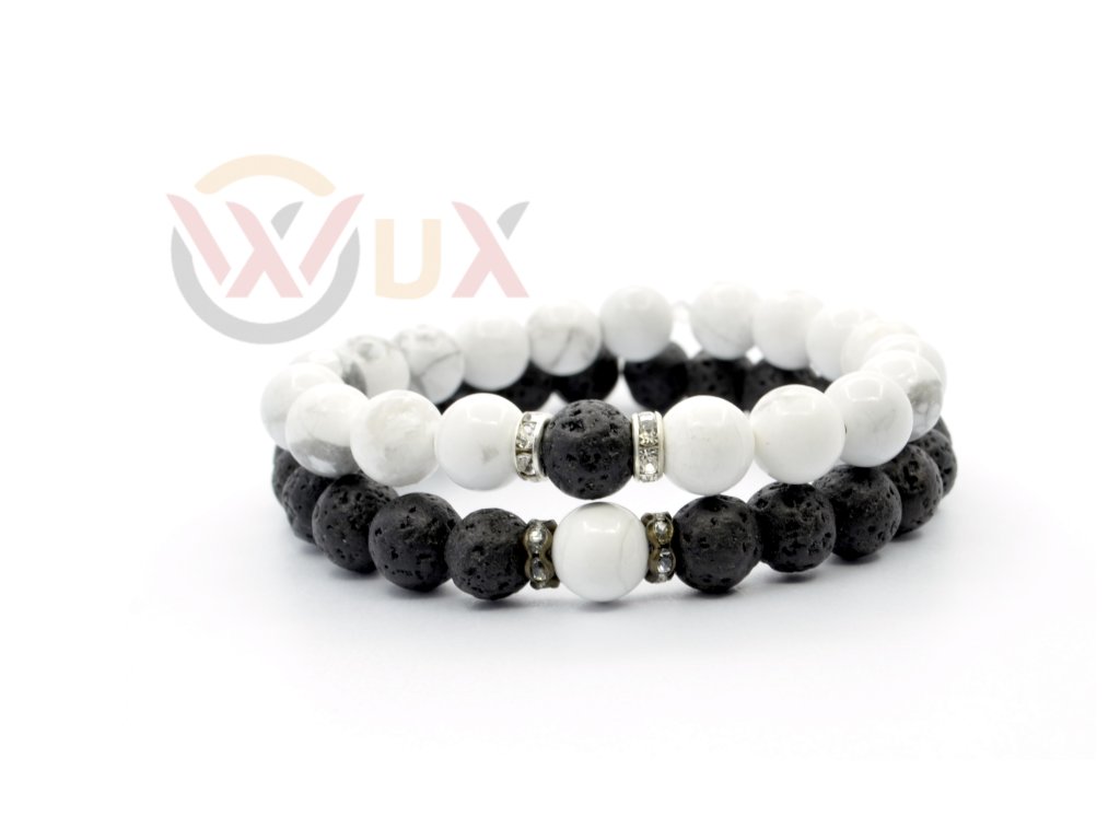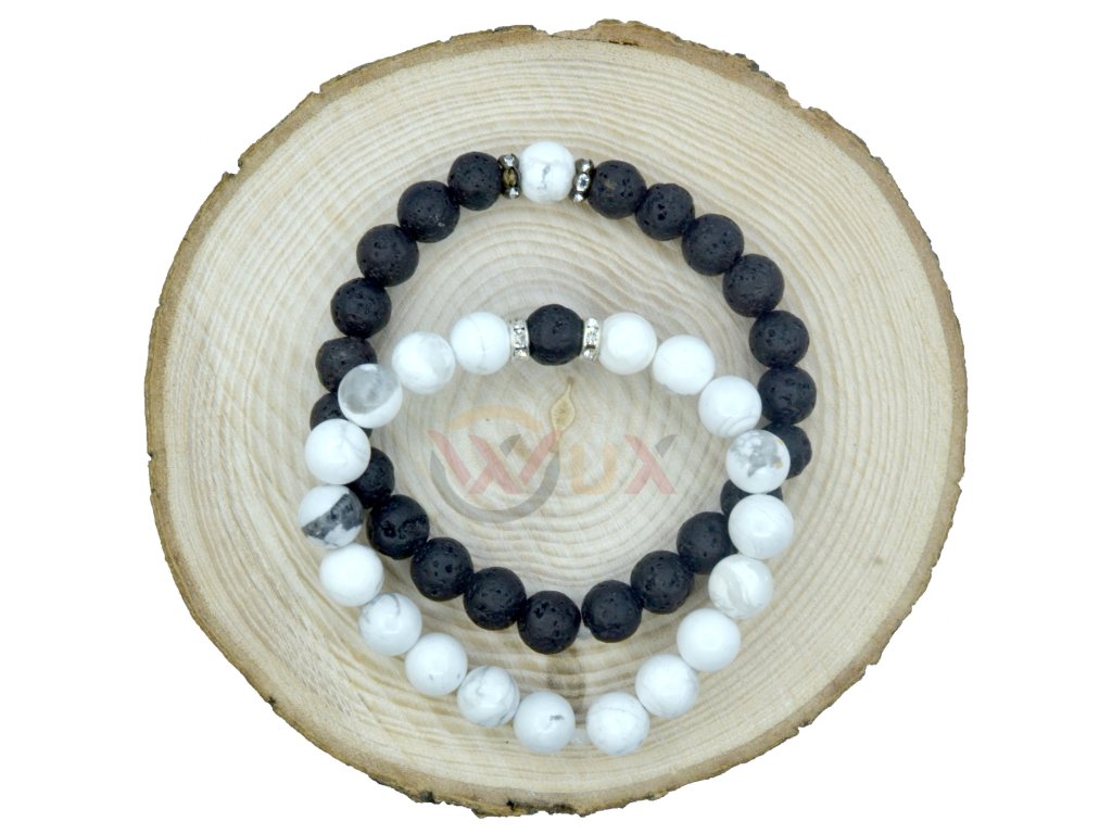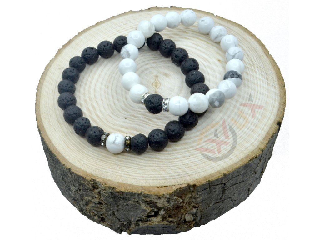 Párové náramky ve stylu Black and White z minerálního kamene bílého Howlitu a kamene Černé Lávy, doplněny o kovové korálky ve tvaru rondelky s broušenými kamínky.