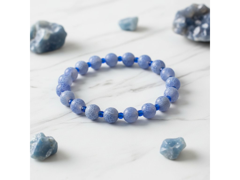Objevte kouzlo našeho korálkového náramku Blue Velvet, který spojuje eleganci a jedinečnost. Tento náramek je vyroben z modrého korálku praskaného achátu, jehož velikost činí 8 mm.