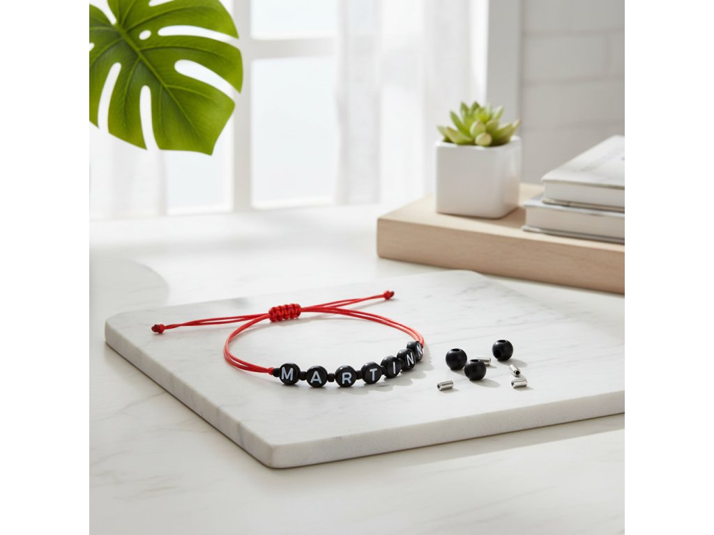 Ukažte svou osobnost a originalitu s naším provázkovým náramkem s vaším vlastním jménem a červeným mezi korálkem! Tento jedinečný a stylový doplněk je ideálním způsobem, jak vyzdvihnout váš outfit. Náramek je ručně vyrobený z vysoce kvalitního provázku, který je pevný a odolný. Korálky s písmenky nemají diakritiku.