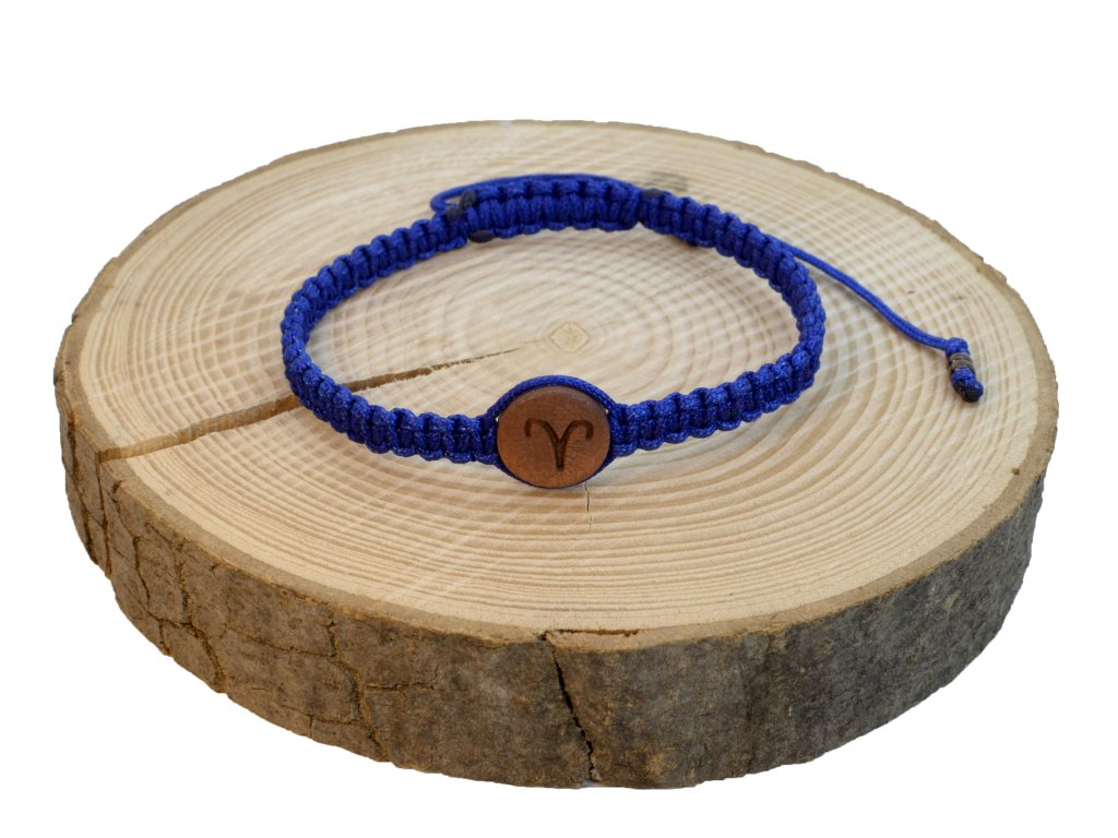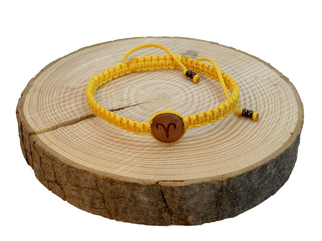 Tento náramek ve znamení Berana je vyroben splétáním odolné šňůrky v makramé stylu. Hlavním prvkem náramku je korálek ve tvaru plochého kruhu ze dřeva žlutokapu s průměrem 12 x 4 mm. Na něm je vyobrazen symbol zvěrokruhu pro znamení Berana. Symbol je pečlivě vyryt do dřeva a vytvořen s ohledem na detaily.
